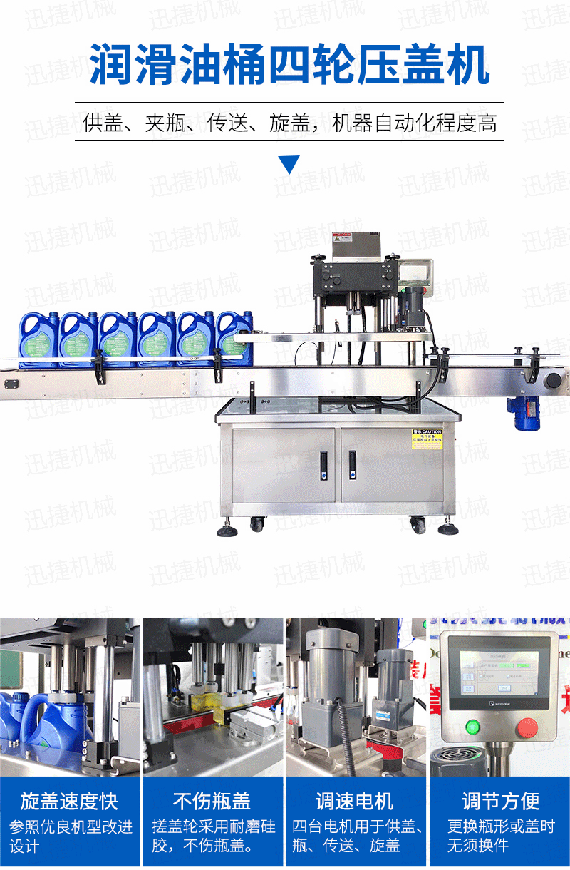 4.我們采用分系統(tǒng)動力控制及供料,提升了灌裝速度;以1L為例,4頭灌裝機每小時可達到1000桶/小時;灌裝在提升灌裝范圍的同時,對計量方式進行了改進,大大提高了灌裝精度,誤差1‰以內(nèi)。5.灌裝頭獨有的雙重防滴漏,灌裝下料口設(shè)計精細,行程短,同時也提高了整條線的灌裝速度和灌裝精度,保證在正常灌裝過程中一滴油都不會滲漏。